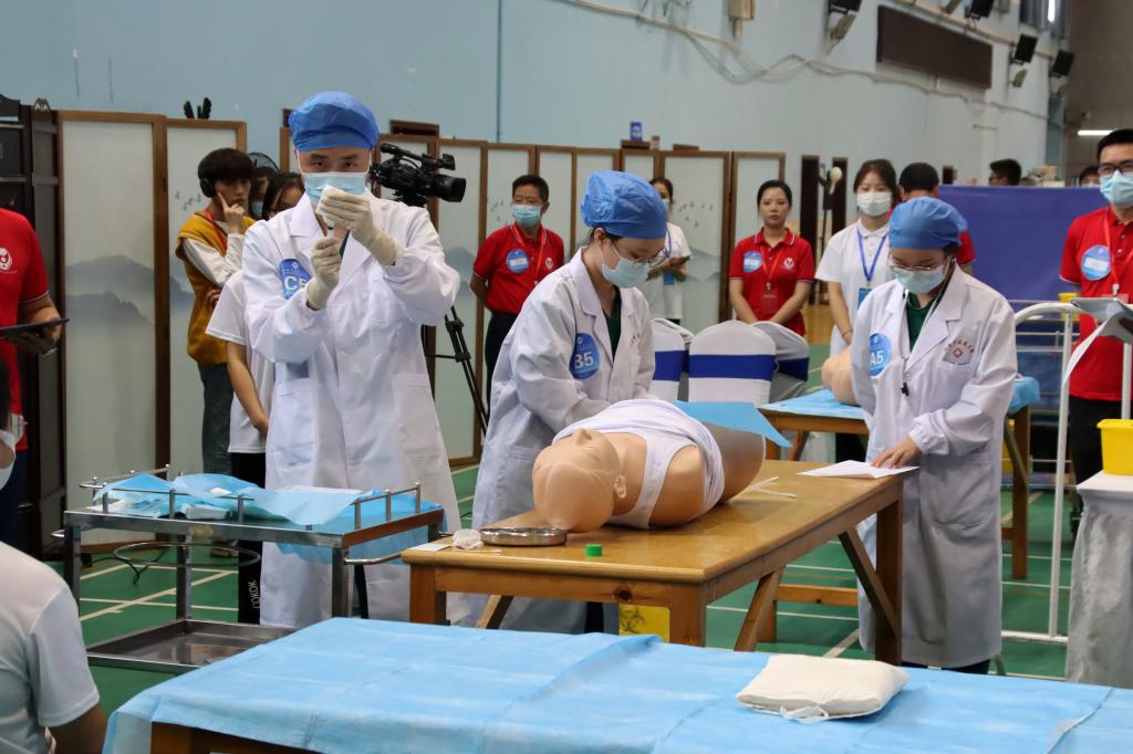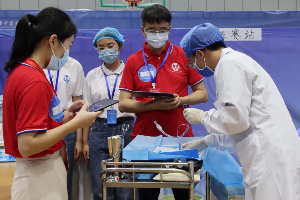 本次竞赛以“良医妙手,志精医道”为主题,分为个人理论赛、个人技能赛及团体赛,每队3名参赛选手均需全程参赛。个人理论赛为机考理论试题,满分200分,占个人总成绩的20%。个人技能赛采用赛站轮转的竞赛方式,分别设置6个赛站,每站竞赛时间为8分钟,包括读题、用物准备、操作,此轮每站考分100分,满分600分,占个人总成绩的80%。
