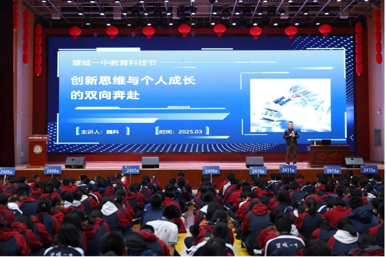 在主题报告环节,魏科副院长结合自身在望城一中的求学经历以及后续个人成长经历,向同学们阐述了创新思维的培养对于自身成长的重要性,并结合临床检测结核分枝杆菌等案例,告诉同学们创新始于细微之处,始于实际生活中的现实需求,始于同学们自己内心的渴望之处,勉励同学们远离手机等电子产品,多静心思考,多激发自己内心的好奇心,多想办法解决一个个小问题。同时,也通过抗病毒药物研发、mRNA疫苗开发历程等讲述科技前沿及其背后的故事,让同学认识到科技创新带来的巨大价值,意识到科技创新需要持续的坚持和努力,也了解到我们国家在医学领域的科技创新还需要很多人的努力。