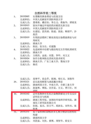 近日,湖南省科技厅发布“2019年度省科学技术奖通用项目拟授奖项目”名单,由我校阳海教授牵头,联合深圳市环境科学研究院和湖南化工研究院有限公司完成的“活性氧物种对有机污染物降解动力学及反应活性位点与机制”项目喜获2019年湖南省科学技术奖励自然科学二等奖。这是我校首次牵头获得该级别奖项,也是该团队在2019年10月获得“中国化工学会基础研究成果三等奖”之后,收获的又一个重要奖项。