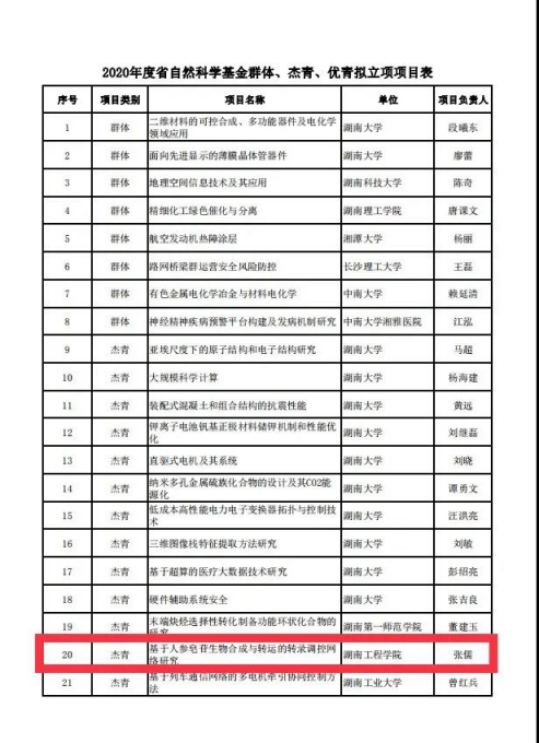 近日,“2020年度省自然科学基金群体、杰青、优青拟立项项目”公示,我院张儒老师获批湖南省杰出青年基金,其项目为“基于人参皂生物合成与转运的转录调控网络研究”,这是学院首次有人获评,也是学校首位获得该基金的教师。
