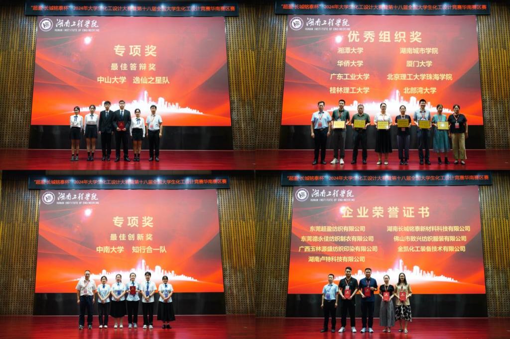 到场专家和企业代表为获奖团队颁奖,大赛最终评选出特等奖13个、一等奖36个、二等奖11个、单项奖5个、优秀组织奖8个、最佳组织奖1个。中山大学、中南大学、厦门大学、湖南大学、湘潭大学、湖南工程学院、广东石油化工学院等12所高校参赛代表队获华南赛区特等奖,其中,我校新醇气和队以特等奖第二名的成绩获得银奖,同时获”最佳组织奖”。华侨大学国际队获华南赛区国际赛道特等奖。特等奖前10名队伍和国际赛道特等奖队伍将代表华南赛区参加今年8月在大连理工大学举办的全国总决赛。