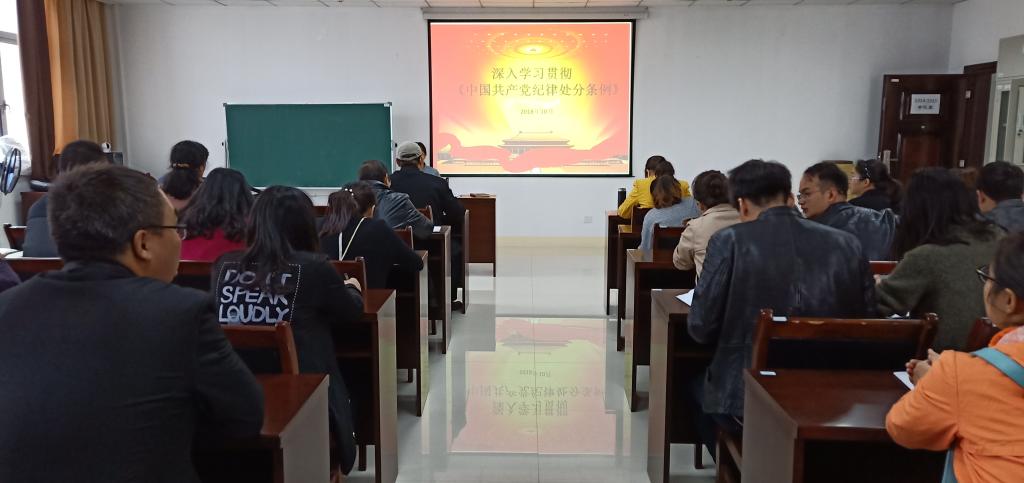 10月19日上午,医学院在会议室集体学习《中国共产党纪律处分条例》及《宗教事务条例》,党委中心组成员及第一、第二职工党支部全体党员参加学习,文红艳担任主讲。