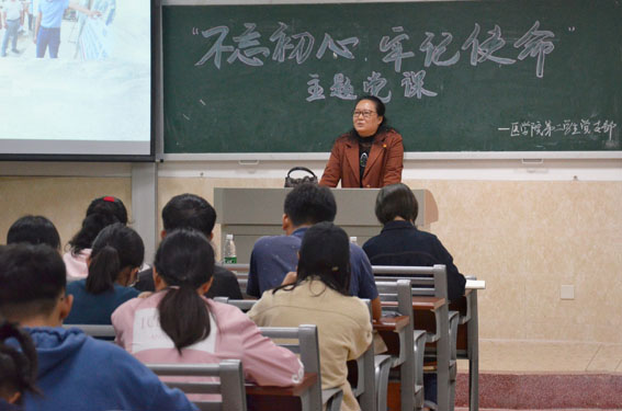 随后,刘娱老师从两个方面进行讲课,一是共产党人的责任与担当,二是医学生的初心与使命。她首先和同学们一起回顾了新中国成立以来的重大成就,这些成就都离不开那些甘于奉献的优秀中华儿女,优秀的共产党员。老师还强调,医学生的初心是“健康所系,性命相托”,希望同学们清楚认识到这句话的含义,多实践,不要空喊口号。老师更以本校优秀学姐学长的事例加深我们对这句话的理解,向同学们介绍了坚守高原岗位的王溪娟和李经国,回归医学岗位的吴广,走在脱贫攻坚第一线的周健以及一直在基层默默付出的王兵等等。刘娱老师最后向同学们表达殷切期望,医学事业需要你们!