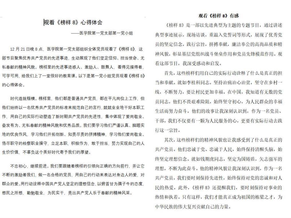为深入学习贯彻习近平新时代中国特色社会主义思想,在全院形成“观榜样、学榜样、做榜样”的浓厚氛围,医学院党委于12月21日组织全体党员通过线上线下集中学习的形式收看《榜样8》专题节目,并分享心得体会。共计3个职工党支部、8个学生党支部、近400位师生党员参与本次活动。