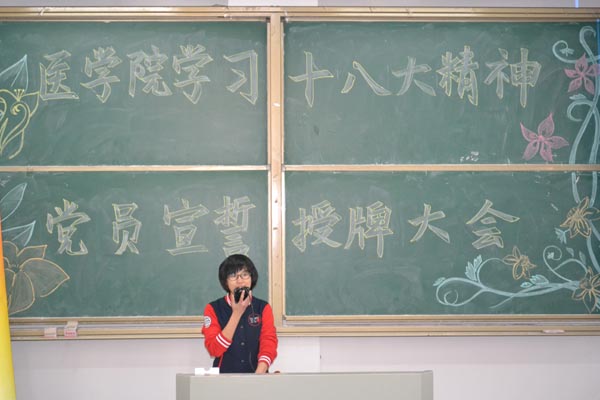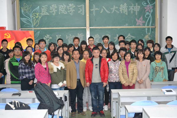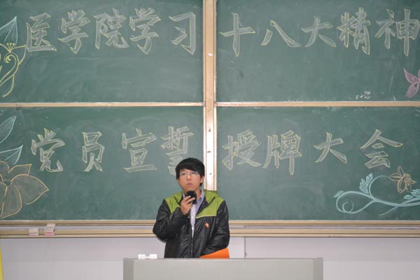 ,在党的十八大胜利召开之际,湖南中医药大学医学院在1206教室举行了学习党的十八大精神暨新党员宣誓和授牌大会。医学院学生管理科老师、新老学生党员共同参加了此次大会。