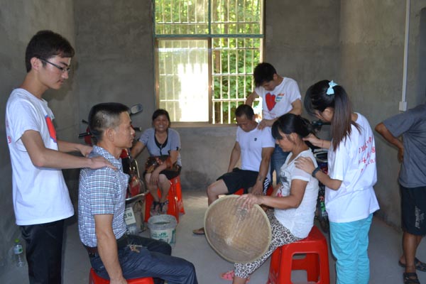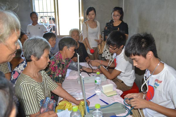在三天时间里,“微尘之光”志愿者队及三名随队医生为当地留守儿童和空巢老人量血压,按摩,学生志愿者们也把募捐来的小孩学习必需品及部分衣物送到了村民家中。