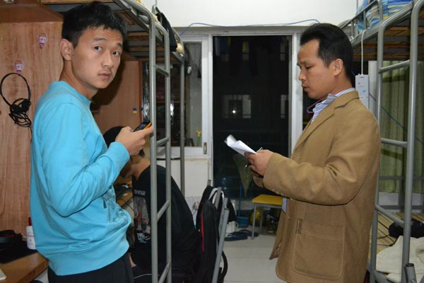 进入学生宿舍,老师们逐一点名清到同学们的在位情况,并要求每个同学均要签到,并对大家的在校、离校情况进行仔细询问,做好详细登记。同时,老师们还告诉大家,离家近回家或外出的同学一定要事前请假,得到批准方可离校,返校后一定要消假。