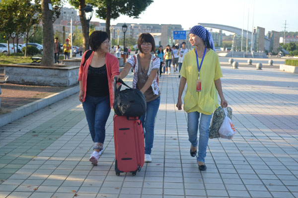志愿者们热心地从家长、新生手中接过繁重的行囊,带领他们向主干道的报到接待点处走去。一路上家长好奇的询问着,我们的志愿者更是耐心的解答回应着。家长和新同学脸上露出的笑容,让我们志愿者看到了自己工作所得到的满意回应和充分认可。