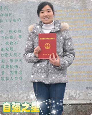 学习上,她勤恳刻苦、扎实努力,获得了2009~2010年度国家励志奖学金和2010~2011年度国家奖学金。工作上,她热情肯干、尽职尽责,在担任学习委员期间,她向大家分享自己的学习经验,带领本班取得了零挂科率的好成绩,使本班学习成绩居于同年级前茅,并获校“三好学生”荣誉称号。生活上,她勤俭朴素、乐于助人,屡次向爱心社捐助衣物,积极参与义务献血。同时,她积极参加各类社会实践活动,如保护母亲河——扫湘江活动等。荣获校“优秀共青团员”称号。另外,她积极参加各项校园活动,在省“党在我心中”和校“党在我心中”合唱比赛中获一等奖、并获第一中医临床学院“优秀副部”称号、校五四文艺晚会“优秀工作者”称号等等。近期她报名参加了湖南省第五届“挑战杯”活动,另外,她正和两个同学组队在我校谭周进老师的指导下,正筹备一个与口腔疾病研究有关的实验。