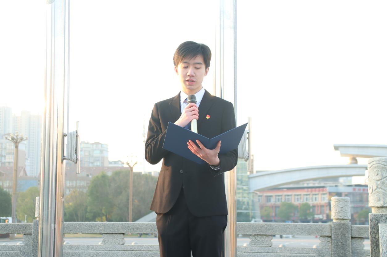 医学院团委副书记徐佳欣带领师生宣誓,承诺为共产主义事业不懈奋斗。