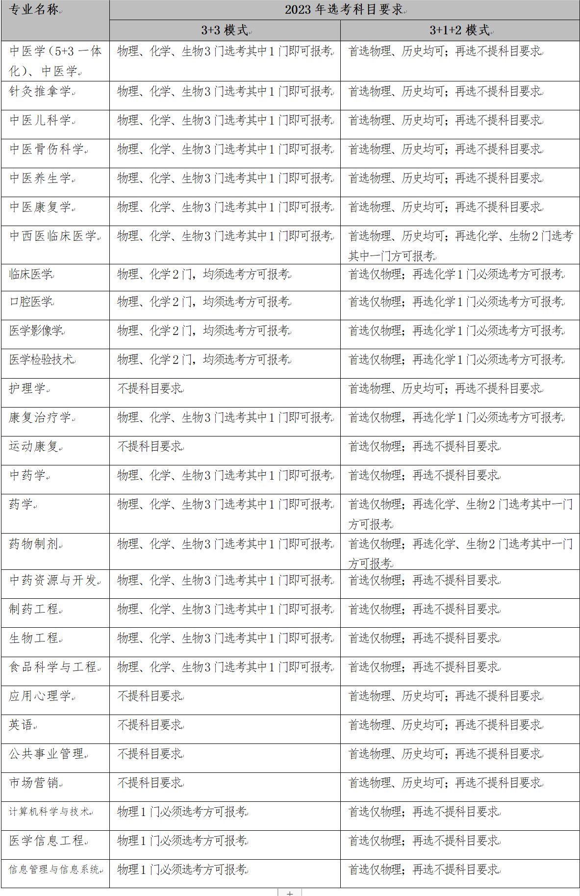 2023年招生专业选考科目要求情况