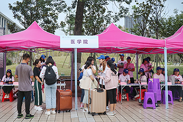 8月30日,在湖南中医药大学含浦校区,医学院迎来575名2019级新生。本次由全体学生管理科老师及152名志愿者共同组成的迎新队伍在医学院党委书记文红艳、院长邓常清、党委副书记王健、副院长雷晓明组成的迎新工作领导小组的带领下开展迎新工作。