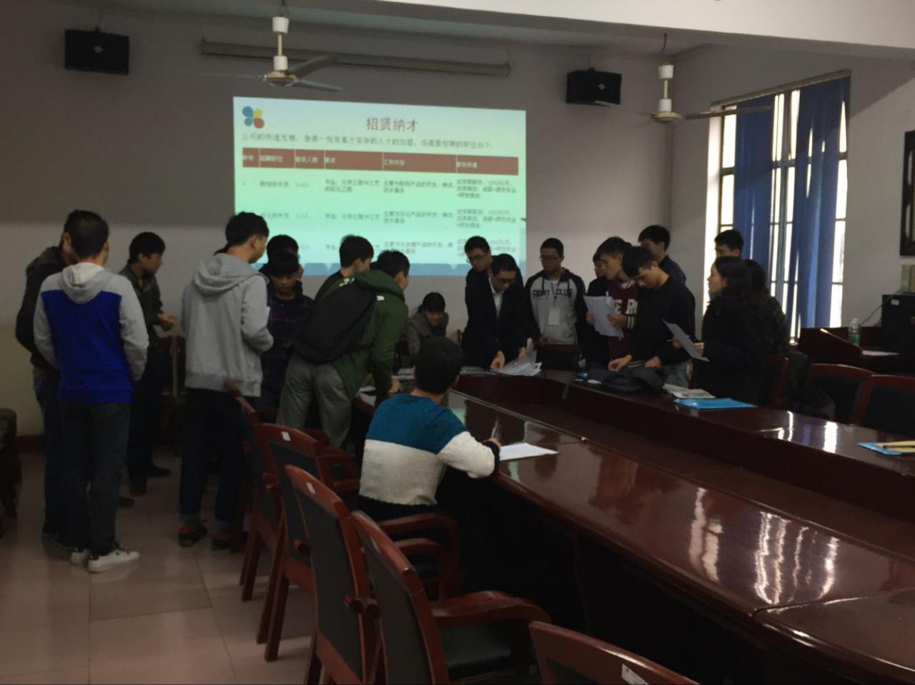 会议伊始,主讲人吴尚富就公司的发展前景,产业结构、地理位置给同学们进行了简单的说明,其中他强调了公司招聘岗位的要求:要有较强的创新能力,能够实现自己的价值,推动社会进步等。随后,彭彦以自身经历告诫同学们,如果能进入公司,一点要踏踏实实地做出成绩,要学会与同事团结互助。紧接着,吴富尚对公司企业文化及发展现状进行了讲解,并对同学们提出的与公司福利、工作薪金有关的问题进行了解答。最后,有意向的同学向公司投递了简历,并当场进行了面试。