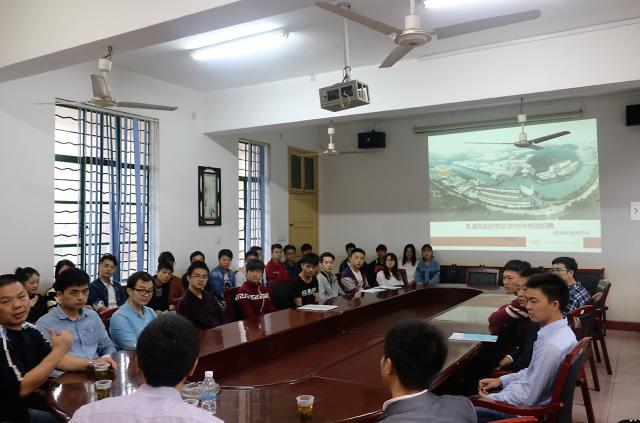 会议初始,李伟霞从产业结构、发展规模和地理位置对该公司做了详细的介绍。其中他把公司的宿舍、食堂和办公大楼这些同学们最为关注的生活和工作环境进行了一次简介。随后,尹建湘就公司的就业前景、公司国际化和行业特色进行了补充。同时,他以自己在公司丰富的工作经验介绍了该公司所具有的优势:公司拥有广阔的发展空间和公司职位的多样化。最后,同学们活跃有序地进行了自我介绍,有意向的同学手持简历准备与该公司负责人进行进一步的交流,全场气氛十分活跃,松弛有度。