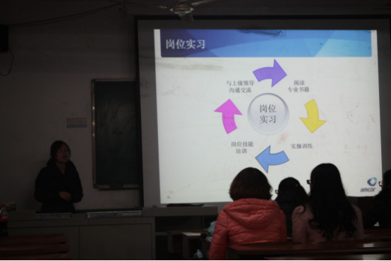 招聘员李鑫以一个生活用品安全的视频引出话题,指出公司能给员工提供安全舒适的工作环境,完善的医疗保障,强调员工的工作安全是公司重点关注问题之一。为了进一步加深同学们对公司的了解,李鑫就安姆科已成为食品、药品、化妆品等领域的领先包装商展开演说,结合ppt向同学们介绍了公司的发展概况、优厚的薪酬待遇、人才的培养计划、灵活的管理以及招聘专业和招聘岗位人数。在人才培养计划中,李鑫对于公司的特色培训课程“我是特种兵”进行了强调。