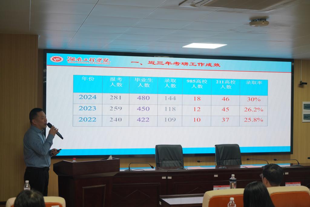 材料与化工学院院长邓继勇作学院考研工作和卓越学风建设经验分享。邓继勇从学院近三年考研成绩情况和学院考研工作措施两个方面分享了学院推进考研工作的具体做法和有效举措。
