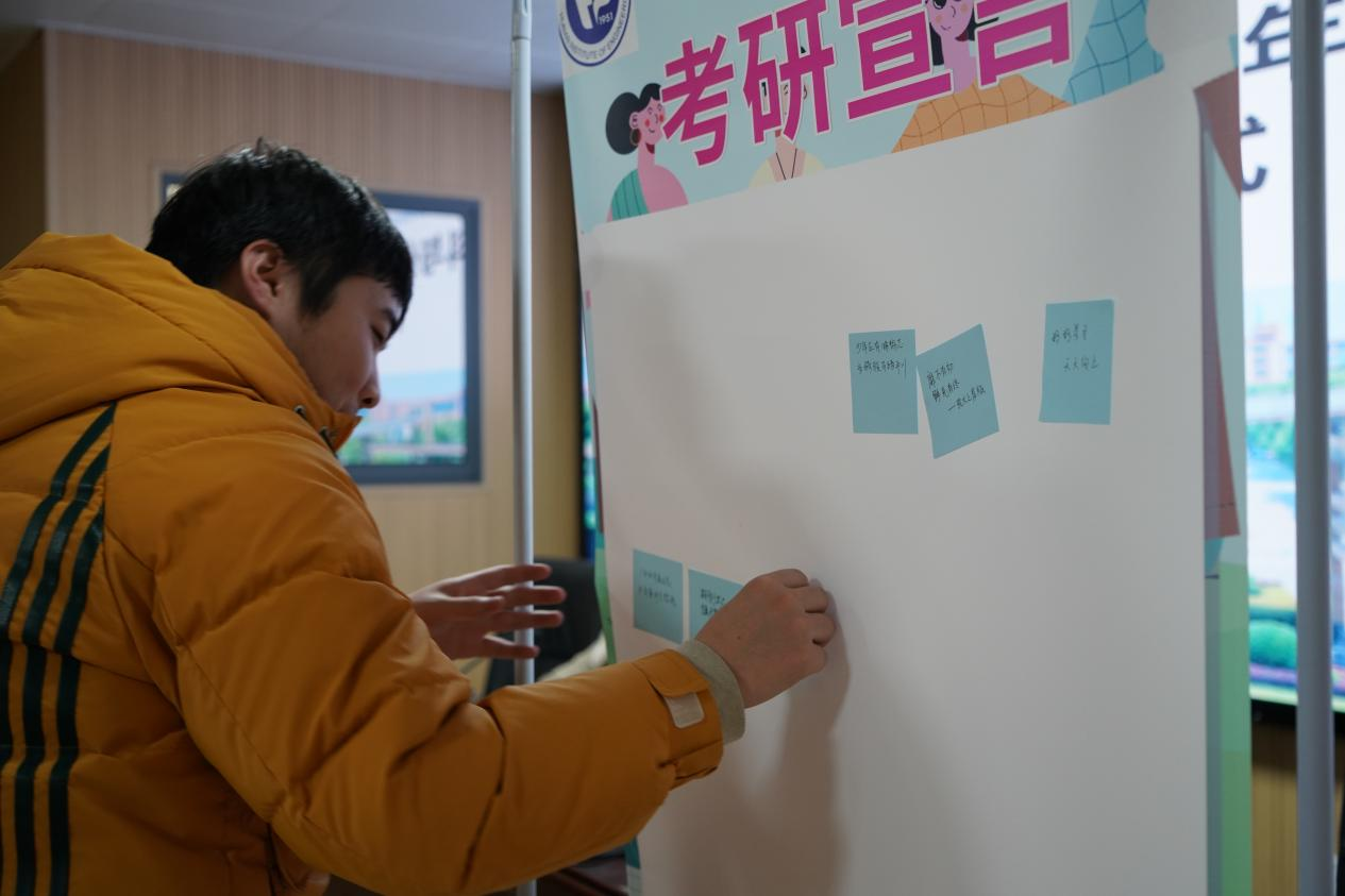 仪式的最后,所有同学在考研承诺书上签名,用笔书写自己的目标和宣言,将一张张承载他们心中的信念与希望的小贴纸牢牢地黏在考研宣言板上。同学们纷纷表示值此春寒料峭却也感受到学院的给予的温暖,在接下去备考的日子里也会全力以赴,以奋斗闪耀青春之光。