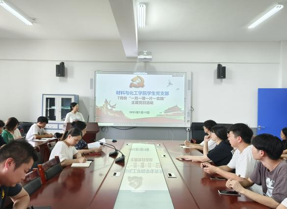 为热烈庆祝中国共产党成立102周年,高标准高质量开展好学习贯彻习近平新时代中国特色社会主义思想主题教育,7月12日中午,材料与化工学院学生党支部在新化工楼304会议室开展7月份以“庆七一 颂党恩”暨“以学正风、以学促干”的专题学习研讨开展“一月一课一片一实践”主题党日活动。