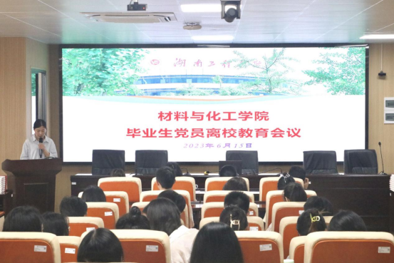 2023届毕业生即将离校,为强化毕业生党员意识和组织纪律观念,让全体毕业生党员时刻牢记党员身份,坚定理想信念,强化责任担当,在未来的学习和工作岗位上继续发扬党员的先锋模范作用,在“七一”建党节来临之际,6月15日,材料与化工学院学生党支部在新化工楼301活动室开展6月份“一月一课一片一实践”暨毕业生党员离校教育活动。学院党委书记严明、副书记罗荃,学生党支部书记,辅导员及党员共计100余人参加了会议。