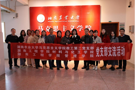 为深入学习贯彻党的二十大精神,进一步加强材料与化工学院党组织标准化建设,不断提升党建工作质量。3月3日下午,材料与化工学院党委书记严明、副书记罗荃、教工和学生党支部书记、支委,管理学院党委书记余博以及教工二支部书记刘喜梅等一行前往湖南农业大学马克思主义学院进行党建工作交流。会议由马克思主义学院党总支书记唐琳主持,马克思主义学院各支部书记、支委参与会议。