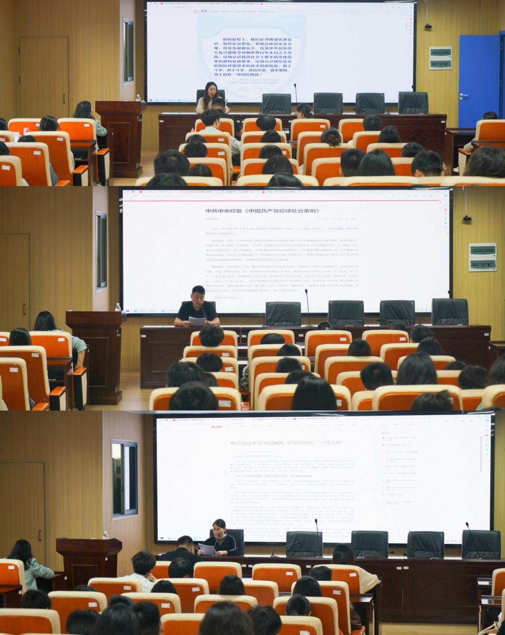 教师党员李娥君、黄玉娟、陶庆忠分别领学《学习习近平总书记强调的“总体国家安全观”》、《牢记习近平总书记嘱托书写新时代“一师之好”》、《中国共产党纪律处分条例》的相关内容,要求支部党员深入学习党的纪律,严明政治纪律和政治规矩,清醒认识和明确自身在维护国家安全中的责任与使命,发挥先锋模范作用,为国家建设和民族复兴贡献力量。