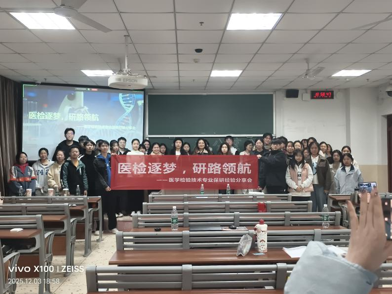 为帮助医学检验技术专业学生明晰保研路径、科学规划学业,2025年12月3日晚,2023级医学检验技术专业保研经验分享会在济世楼302教室顺利举行。本次活动以“医检逐梦,研路领航”为主题,特邀本院保研成功的三位学姐进行经验分享,吸引了23,24级医学检验技术专业同学参与。