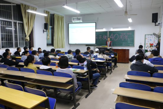 活动围绕改革开放,青年奋进的话题,结合各种娱乐节目的形式开展。班会活跃的气氛仿佛使人们回到了1979年的那个春天,万物更替,欣欣向荣,一片大好的奋斗蓝图就在那春风中徐徐展开。在改革开放40周年的背景下,同学们积极踊跃发言,结合大学生活,与当代青年学生共同做出勉励:肩负重任,勇往直前。活动中,改革开放的春风伴着同学们婉转的歌声传遍中外,新时代的主题思想在即兴问答中走入心间。