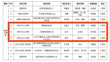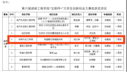 7月17日,第六届湖南工程学院“互联网+”大学生创新创业大赛结果公示,在高教主赛道组,我院材料化学1701班成江涛获二等奖,化工1703班汤孟兰、高分子1801班黄芬、轻化1301班彭杰获三等奖。