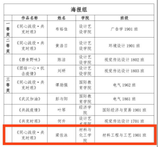 7月16日,湖南工程学院“同心战疫·共克时艰防控新冠肺炎疫情主题文艺作品创作大赛”比赛结果出炉,此次大赛面向全体学生征集抗击疫情的文学、书画、摄影类文艺作品,致敬所有抗疫期间奋斗在一线的医护人员,激发战“疫”正能量。经过评选,我院生物工程1802班李慧情获征文组二等奖,应用化学1801班叶美华获征文组三等奖,化学工程与工艺1901班梁佐泳获海报组三等奖。