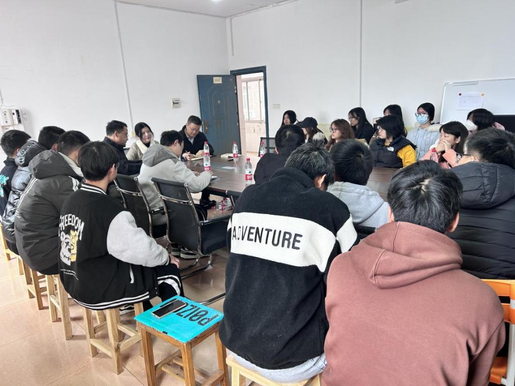 12月13日上午,在湖南工程学院滨江校区2栋学生“一站式”社区服务中心举行了一场别开生面的学业及生涯发展指导座谈会。学生工作处林志刚副处长、材料与化工学院党委副书记罗荃、滨江学生社区站长李俊、学院2023级年级辅导员王祥若、轻化工程2301班班主任黄保钰及该班全体学生们参加。