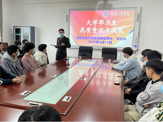 为鼓励应届毕业生积极参军入伍,做好2022年湖南工程学院大学毕业生应征入伍工作,4月15日下午,材料与化工学院邀请学校人民武装部副部长刘宸均在化工楼A304会议室为学院2022届毕业生进行征兵入伍政策宣讲。会议由材料与化工学院党委副书记陈镇主持,学院党委书记张何、征兵专干陶庆忠及意向入伍毕业生等参会。