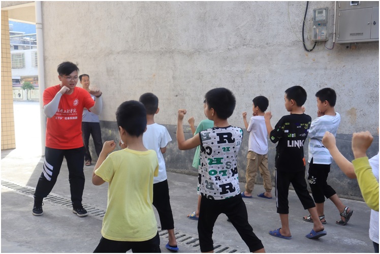 “以后学会了武术要保家卫国,我想当一名军人。”“我学会武术后,要保护我的爸爸妈妈。”武术课上,成员们双脚开立,左手从腰间冲拳而出,转马步为弓步,顺势一个照面直踢,腾空再踢,落下时竖岔着地,双臂侧平举立掌……动作好比行云流水一般,赚足了眼球,很快吸引了大批小男孩的眼光。孩子们观看完之后,纷纷加入到武术课堂里。实践团成员把动作逐一分解,一步步耐心地教孩子们,对动作进行纠正。