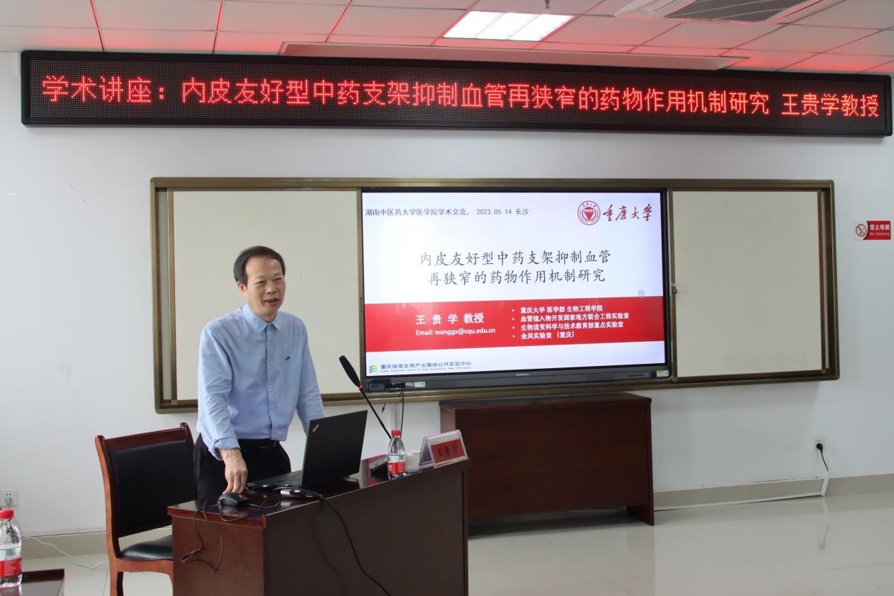 2023年5月14日上午,重庆大学医学部生物工程学院、国家生物产业基地公共实验中心(重庆)主任、血管植入物国家地方联合工程实验室主任王贵学教授来我院做学术交流。本次讲座在医学院会议室举行,由医学院院长庹勤慧主持,副院长雷晓明、唐群,药学院副院长林丽美以及医学院相关领域青年教师和研究生参加了此次讲座。