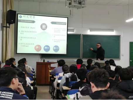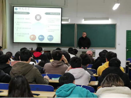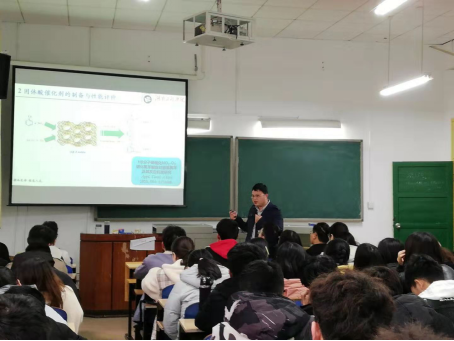 会上,邓人杰博士以二氧化氮催化硝化芳烃制备芳香硝基化合物为主题,从“课题的研究背景与意义”、“固体酸催化剂的制备和性能表征”、“芳烃硝化体系的构建”以及“芳烃硝化反应的理论研究”四个方面进行讲解。邓人杰结合自身科研经历深入浅出的阐述了一条绿色硝化反应在芳烃硝化中的应用,同时鼓励学生敢于创新,勇于实践,把更多的精力投入到专业的学习中去,提高自身专业素养。