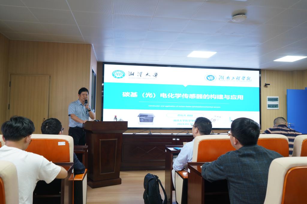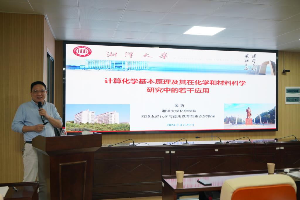 4月30日下午,我院在材化楼A301会议室举办卓越大讲堂,湘潭大学两位杰出学者——裴勇教授和费俊杰教授,分别作了题为“计算化学基本原理和若干应用实例”和“碳基(光)电化学传感器的构建与应用”的专题学术讲座。讲座吸引了学院100余名师生参加,现场座无虚席。这场讲座不仅丰富了师生的学术视野,也为学院的学术交流增添了浓墨重彩的一笔。