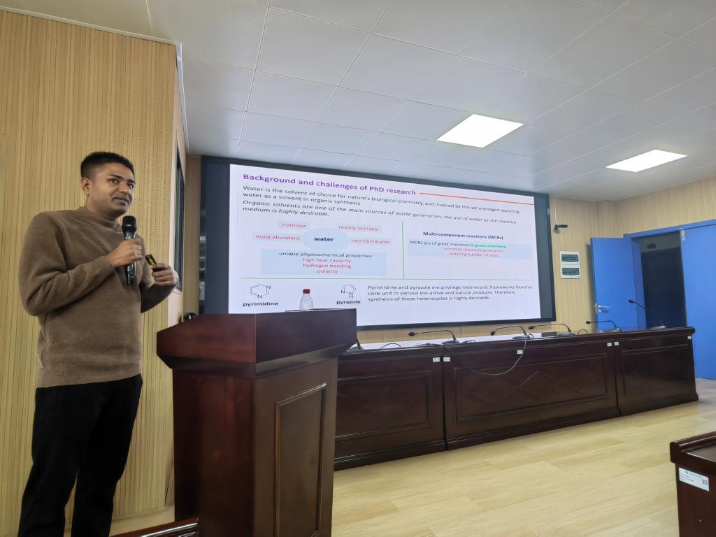 报告中,Kalita博士详细介绍其在印度、中国、韩国以及日本等多个国家的留学经历,汇报了其在绿色合成领域的最新研究成果。通过他的研究,有望实现对重要杂环化合物的更加环保和经济的生产方法,这对于医药、农业、材料科学等领域具有重要意义。此外,他还分享面临的挑战及解决方案,为在座的研究生和年轻老师提供宝贵的经验和启示。