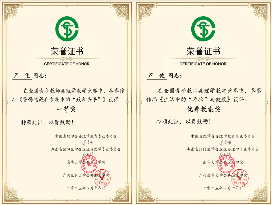 8月15至18日,中国毒理学会毒理学教育专业委员会第七届高校毒理学教育论坛教师教学基本功比赛在湖南省衡阳市南华大学圆满落幕。我校医学院预防医学教研室芦俊老师凭借扎实的教学功底与创新的教学设计,在理论教学组激烈角逐中脱颖而出,荣获一等奖及优秀教案奖双项荣誉。