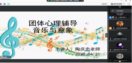 2020年4月21日晚上七点半,由于疫情的影响,我院在线上组织了心理委员的团体辅导活动,此次活动主题为“音乐与意象”,由陶庆忠老师主持。