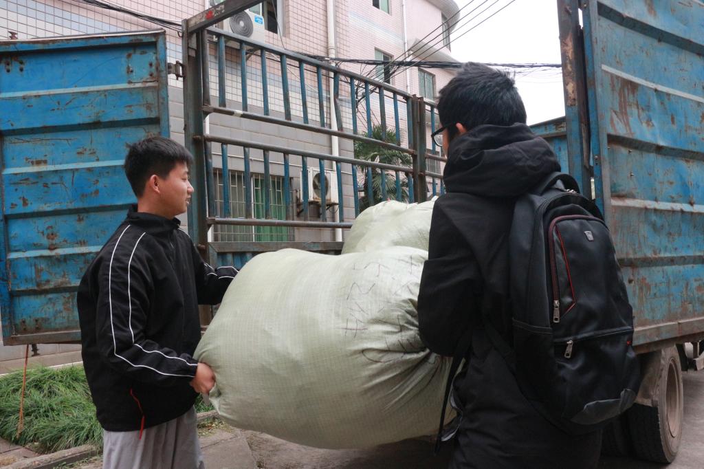 社员们合力将衣物抬上物流车