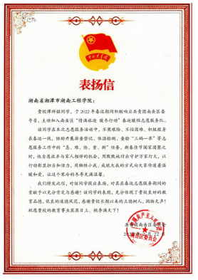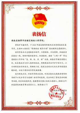 张诚浩、谭祥铭、旷竹鑫、苏雨佳等同学正是我院学子在寒假期间建设家乡、志愿服务的部分同学代表,他们用实际行动为疫情防控贡献自己的青春与力量,诠释了新时代大学生的责任与担当。材料与化工学院积极引导学生将思想政治教育与社会实践相结合,不断增强思想政治教育的实际效果。学院作为湖南省第二批“三全育人”试点单位,将以“为党育人,为国育才”为目标,着力培养德智体美劳全面发展的社会主义建设者和接班人。