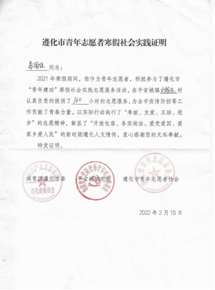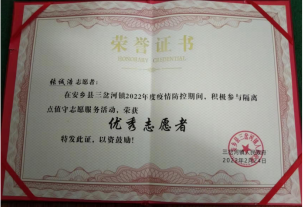 (三岔河镇人民政府为张诚浩颁发的“优秀志愿者”荣誉证书)