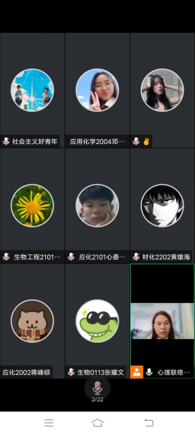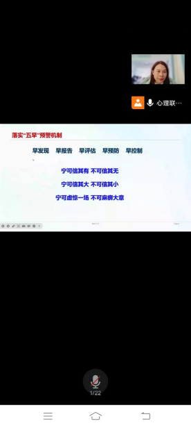12月7日中午,材料与化工学院开展主题为“大学生心理危机识别与和干预”的培训活动,该活动由心理专干黄玉娟老师主讲,活动采用线上和线下相结合模式,全院心理委员及寝室联络员在腾讯会议参加,心理联络部全体成员在滨江团体辅导室参加。