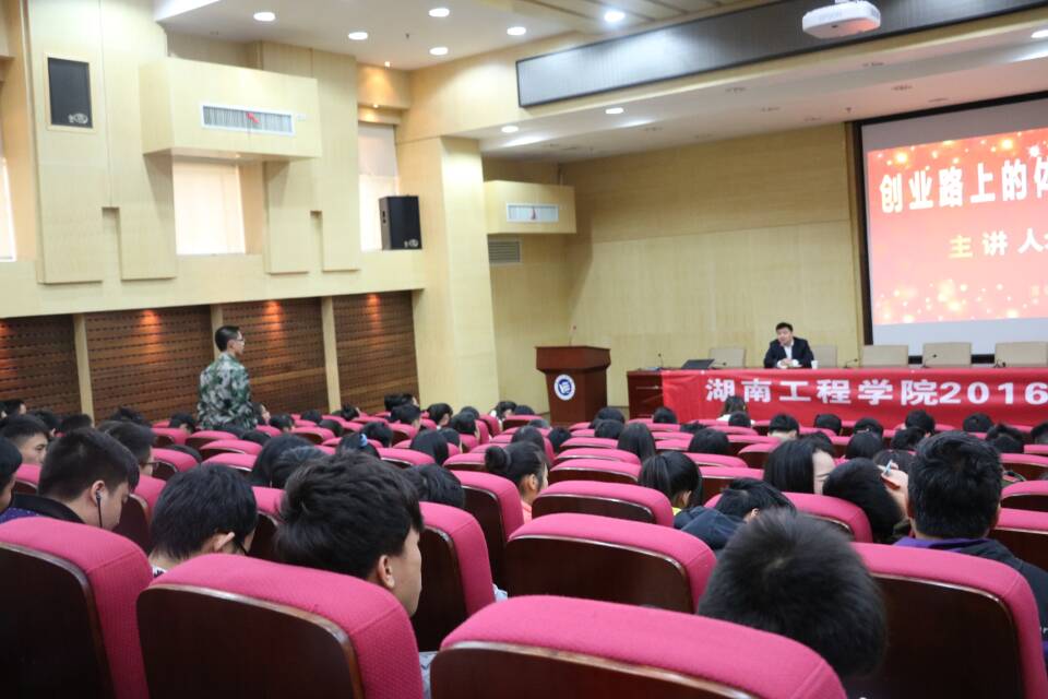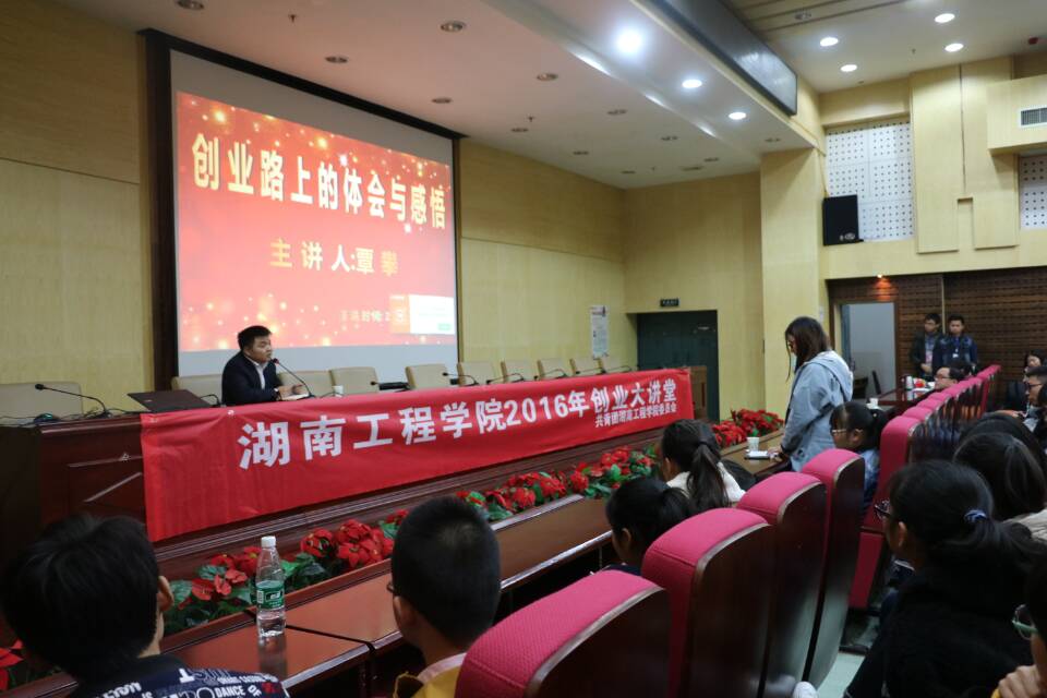 11月11日下午3点,由湖南工程学院校团委主办,化学化工学院承办的“创业大讲堂”专题讲座于图书馆一报告厅成功举办,我院特地邀请了在创业路上有所建树的学长覃攀来为我院学生做了精彩的演讲,另外出席本次讲座的还有化学化工学院副院长张何、学办主任吴菲以及我校学生,讲座由张何主持。