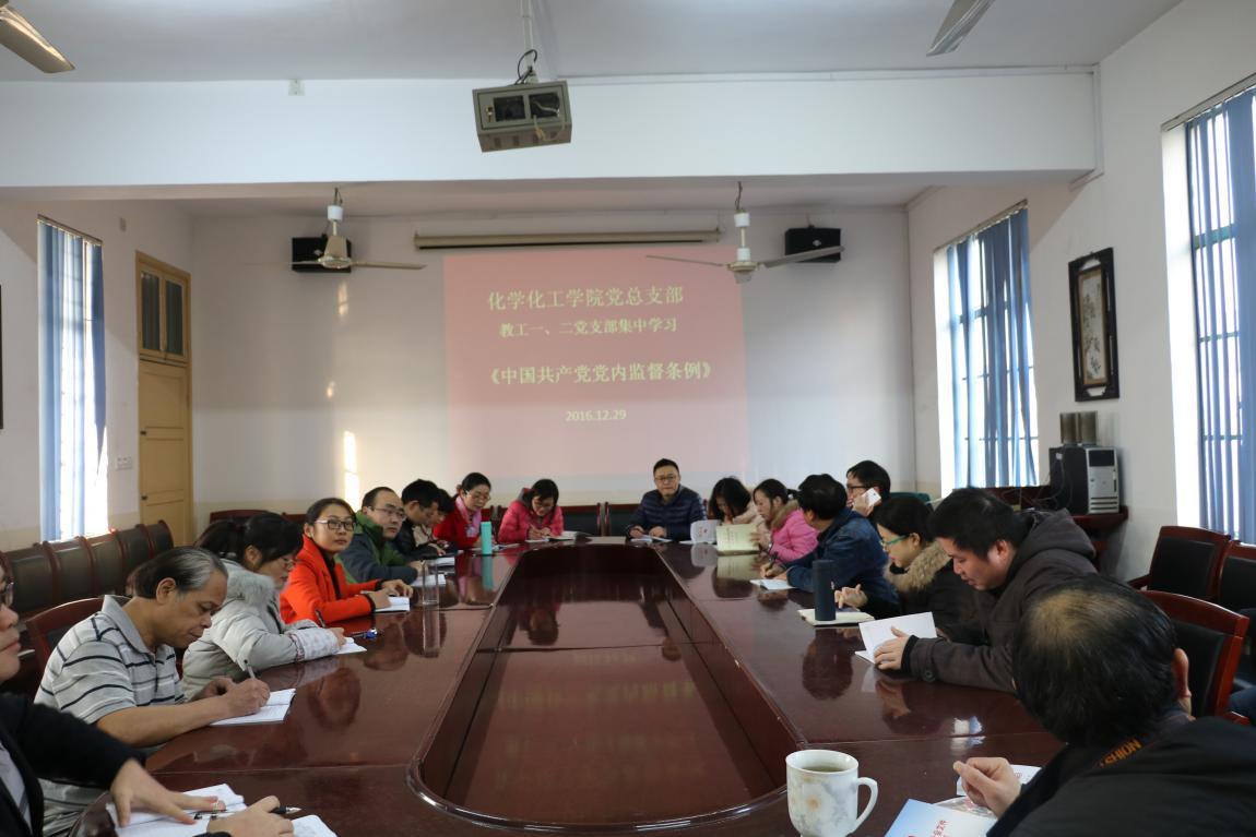 12月28、29日,化学化工学院党总支部教工第一、第二党支部联合在四教306会议室组织召开全体教职工党员会议,集中专题学习习近平总书记系列重要讲话,《关于新形势下党内政治生活的若干准则》(简称《准则》)和《中国共产党党内监督条例》(简称《条例》),深刻领会十八届六中全会精神,并就学习贯彻落实提出明确要求,会议由化学化工学院党总支书记胡爱钦主持。