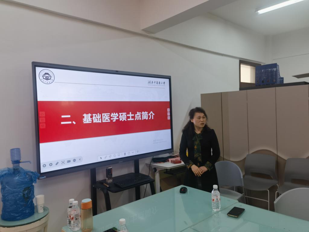 活动中,何迎春结合学院《基础医学硕士学位点基本情况简介》,从专业设置、师资队伍、科研平台、实践教学条件等方面,系统介绍了基础医学硕士点的整体概况。她指出,基础医学作为现代医学发展的重要基石,承担着培养“复合型学术人才”的重要使命。学院现有临床医学、医学影像学、医学检验技术3个本科专业,拥有基础医学、临床医学(基地培养)2个一级学科硕士学位授权点,已形成“本科—硕士”贯通培养的人才培养体系。学院现有专任教师99人,其中教授24人、副教授32人,博士生导师9人、硕士生导师26人,拥有全国优秀教师、享受国务院特殊津贴专家、教育部课程思政教学名师等一批高水平师资,为研究生培养提供了坚实保障。