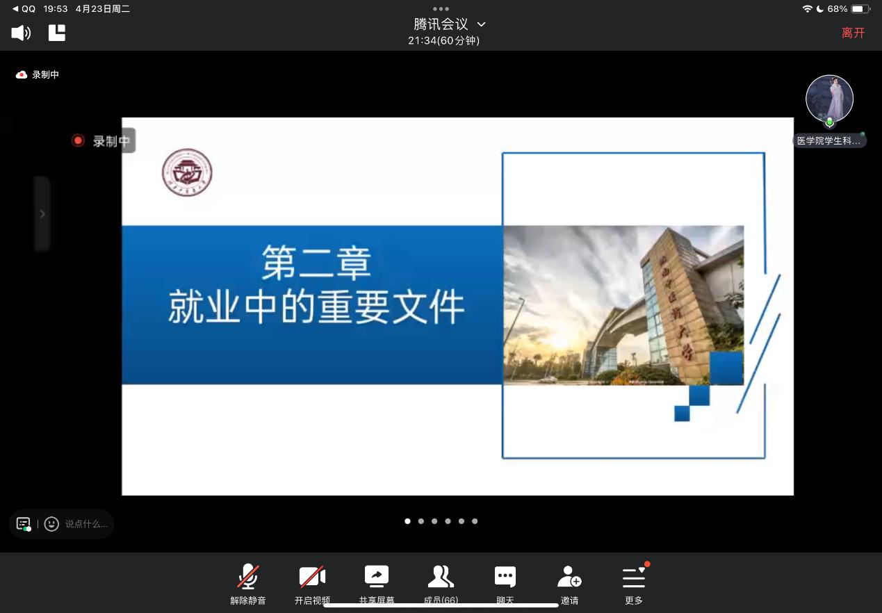 目前就职于武汉东西湖区基层卫生院的郝婷也带来了她的经验分享。郝婷首先回顾了去年考研到就业的心路历程,这段经历也引起了目前处于迷茫阶段的同志们的共鸣。郝婷提到,在求职过程中要关注多方面的求职平台,如本校、外校招聘会等。她提醒大家在求职和工作过程中要保持良好的心态,不断鼓励自己。关于面试,郝婷提出了两点关键因素——勇于回答和微笑面对。最后,郝婷还就同学们提出的“劳动合同”问题和“五险一金”问题做出耐心解答。郝婷坦言,应届毕业生面临着许多就业机遇与挑战,希望大家充分利用自身优势,迎难而上,成就自我,收获成长。