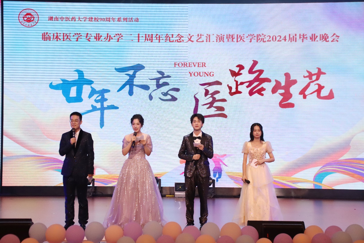 6月6日晚7时,湖南中医药大学“廿年不忘,医路生花”临床医学专业20周年纪念文艺汇演暨医学院2024届毕业晚会于含浦校区学生活动中心圆满举行。原医学院党委书记肖子曾、文红艳,招生就业处处长、原医学院院长庹勤慧、医学院全国优秀教师卢芳国、学生工作部部长朱久宜,校团委书记银洁,医学院党政领导班子、教师代表、2024届毕业生及家长共计500余人参与本次晚会。