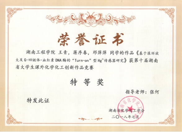 指导国家级、省级大学生创新项目各1项,指导湖南省“挑战杯”大学生课外学术科技作品竞赛获二等奖1项(省级),指导湖南省大学生创新作品竞赛获二等奖、三等奖各1项(省级),指导学生获得湖南省创新创业大赛优秀团队奖(省级),指导湖南省大学生化学化工创新作品获奖5项,其中特等奖2项(省学会级)。